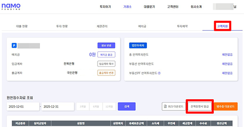 특정 일자를 지정하여 해당일 기준 투자잔액과 예치금의 확인이 가능합니다.